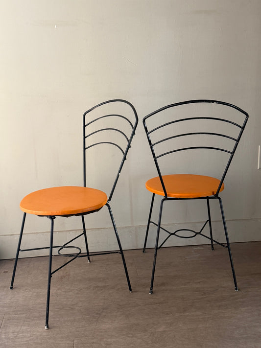 Metal wire chairs with orange seats. Sold as a pair.