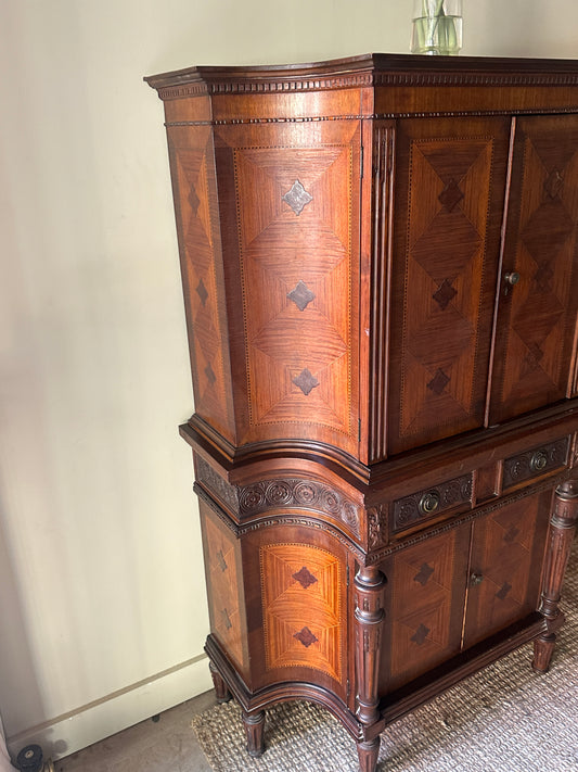 Sold outCarved Walnut Inlay Cabinet
